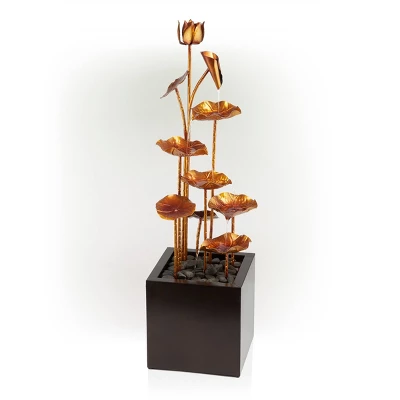 - BEAUTIFUL DESIGN: Copper-colored leaves that elegantly cascade water down to the river rocks in the modern base create a look that is stylish with any decor