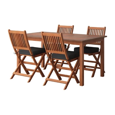 This patio dining set, crafted from hardwood is the perfect gathering spot for your alfresco dining space! Showcasing a classic silhouette and slatted tabletop and backrest, it brings a classic coastal feel to any patio. The table is equipped with a 2″ drilled umbrella hole to temper those too-sunny days and the chairs fold up for easy storage. Coming with four matching chairs, it’s perfect for patio dinners, poolside cocktails, or even an impromptu work-from-home option!