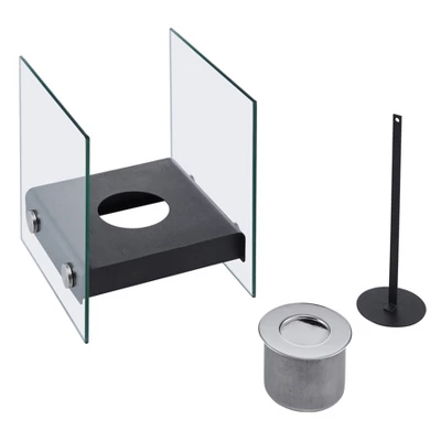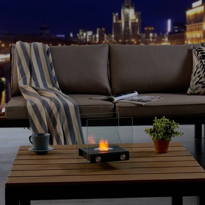 Square (7.5″ wide) tabletop fireplace with dual glass panel hurricanes is small enough to put practically anywhere in your home. Featuring a bio-ethanol fuel system, this little fire pit can be used outdoors or indoors and creates no smoke. The clear glass upright panels combined with the matte black metal will help add touches of modern design to your decor while providing the warmth of an open flame.