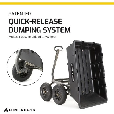 Haul heavy loads and get your items where they need to go with the Gorilla Carts Super Heavy-Duty Poly Yard Dump Utility Cart. With a carrying capacity of up to 1,500 pounds, this industrial wagon cart is great for transporting heavy objects through your yard, throughout the garden, or around the farm.The rolling utility wagon cart contains a durable steel mesh bed measuring 49.6 inches long by 32.6 inches wide that provides durability when carrying heavier items. The garden cart’s 16-inch pneumatic tires ensure usability and smooth maneuvering on many different terrains. The patented quick-release dumping system allows you to unload whatever you’re hauling with ease. The steel garden cart’s padded 2-in-1 handle can be comfortably pulled by hand or conveniently hooked up to an ATV or lawn tractor hitch for hauling heavier loads.The simple steel frame design of this utility cart allows for quick and easy assembly. Make hauling heavy loads easy and convenient with the Gorilla Carts 1,500 Pound Capacity Super Heavy-Duty Poly Yard Utility Cart.