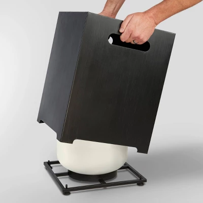 Coordinating perfectly with the Lanesboro Gas Fire Pit, the Lanesboro Propane Tank Cover is the perfect addition to your outdoor living space. Made of the same long-lasting powder-coated iron as the Lanesboro Fire Table, this tank cover is durable and stylish. While doubling as a side table, this tank cover conceals your 20lb. propane tank (not included). Includes tank seat with leveling feet.