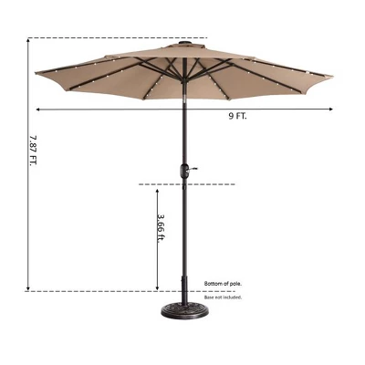 - SOLAR PATIO UMBRELLA – This stylish 9-foot canopy features a push button tilt and easy-to-use crank handle that make UV protection a breeze at any time of day, while the 32 solar powered LED lights on the underside are perfect for evening entertaining.