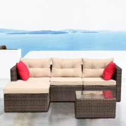 5pc Outdoor Rattan Wicker Conversation Set – Brown/Beige/Red – GODEER