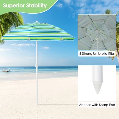 - Equipped with a removable sandbag, this holiday outdoor umbrella enhances wind resistance by weighting the bottom, making it less likely to tip over when used at the beach. And the umbrella is supported by 8 strong fiberglass ribs to ensure good sturdiness and stability.