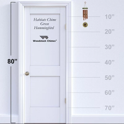- Green wash finish ash wood, 6 bronze aluminum tubes, antiqued copper-plated steel hummingbird, removable windcatcher for easy customization